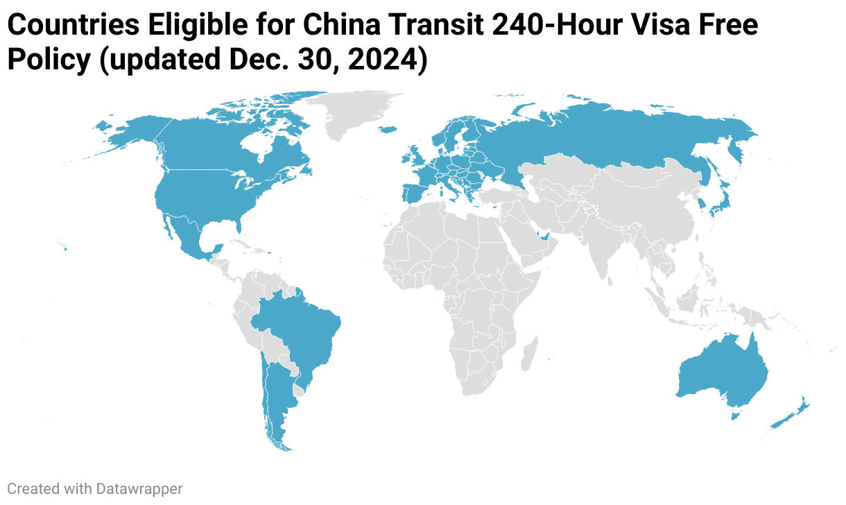 Countries Eligible for China Transit 240-Hour Visa Free Policy (updated Dec. 30, 2024)