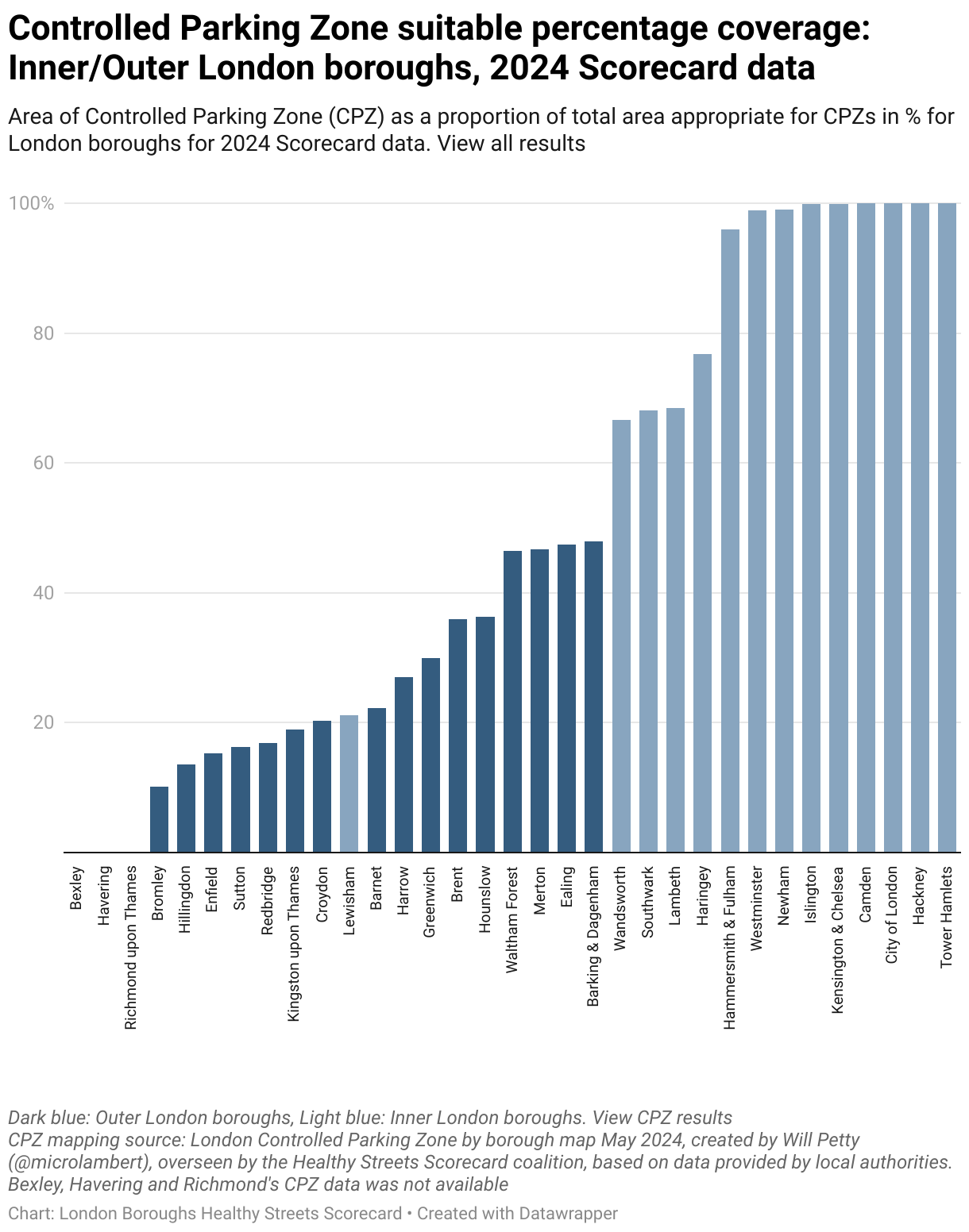 Controlled Parking Zone suitable percentage coverage: Inner/Outer London boroughs, 2024 Scorecard data