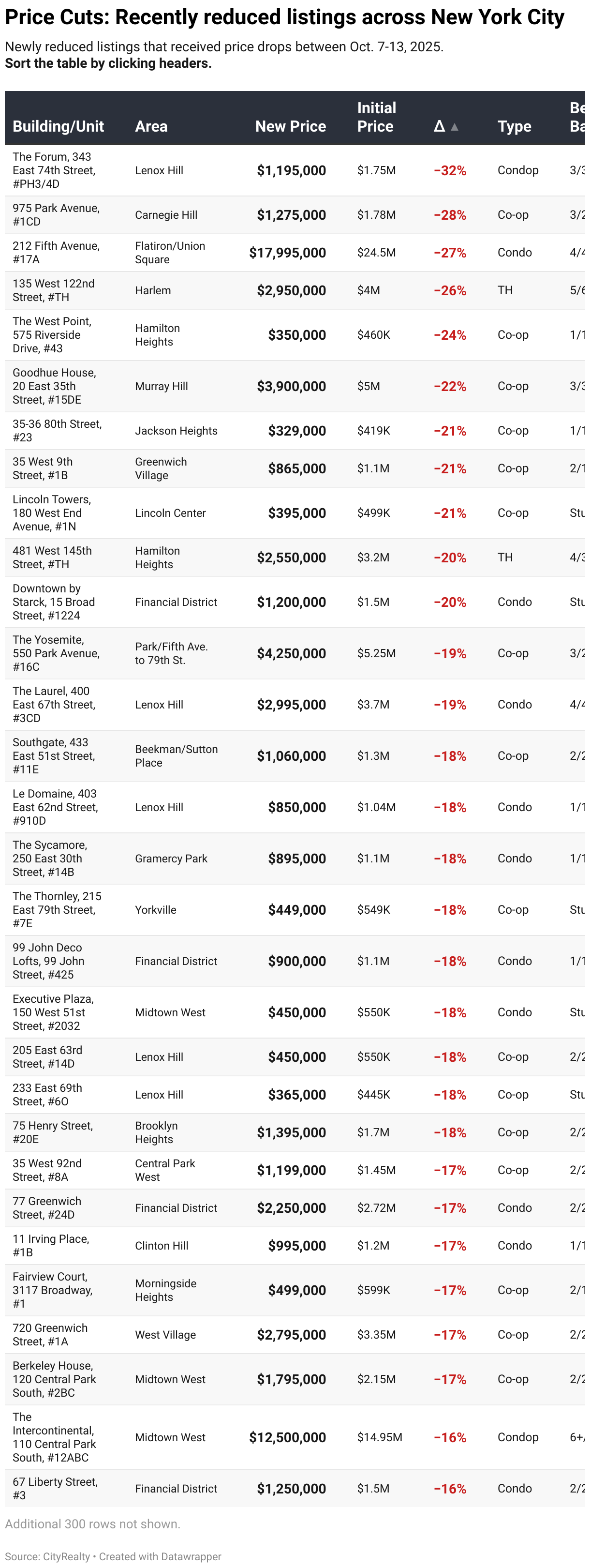 Newly reduced listings that received price drops between Oct. 7-13, 2025. Sort the table by clicking headers.