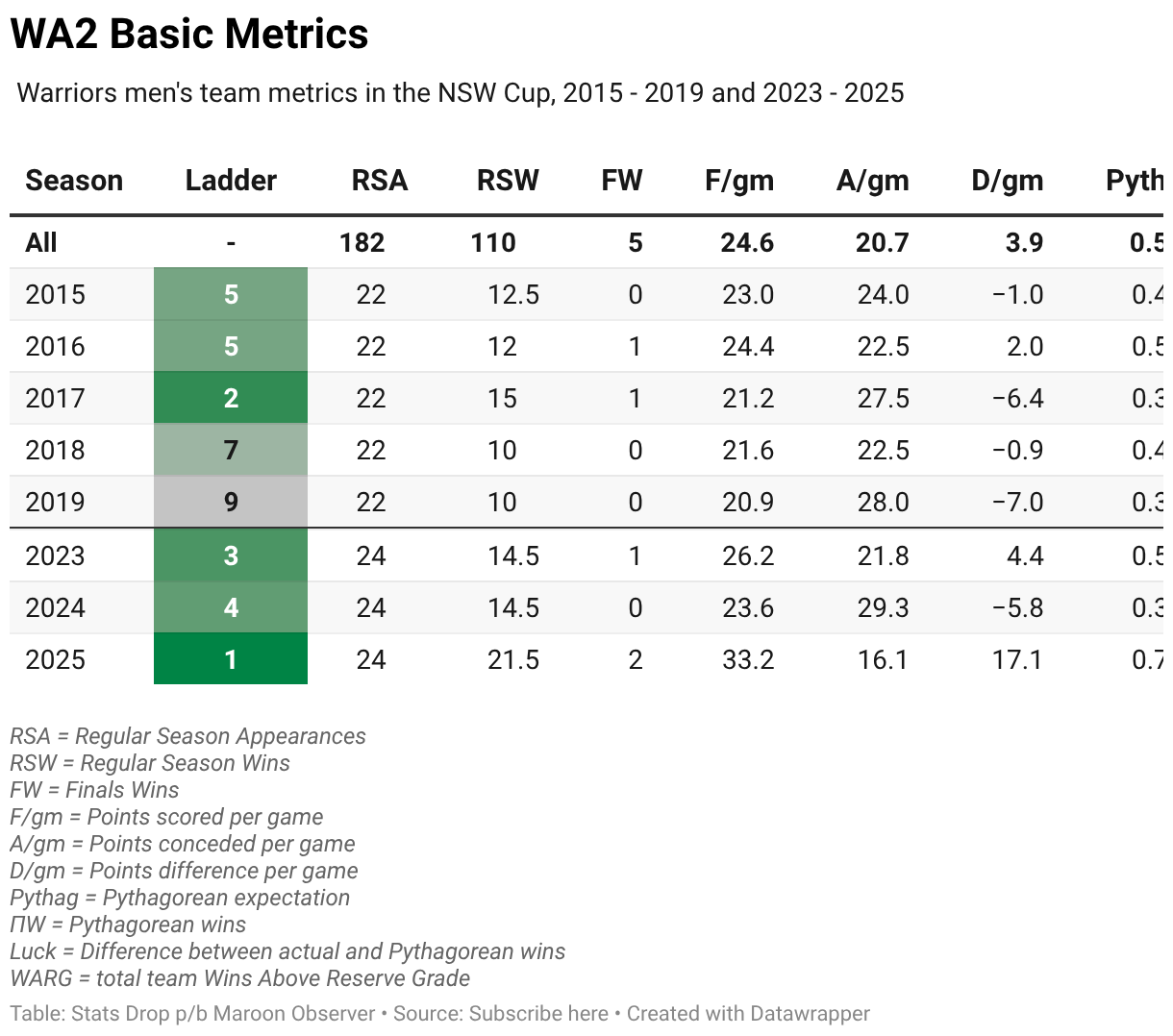 Warriors men's team metrics in the NSW Cup, 2015 - 2019 and 2023 - 2025