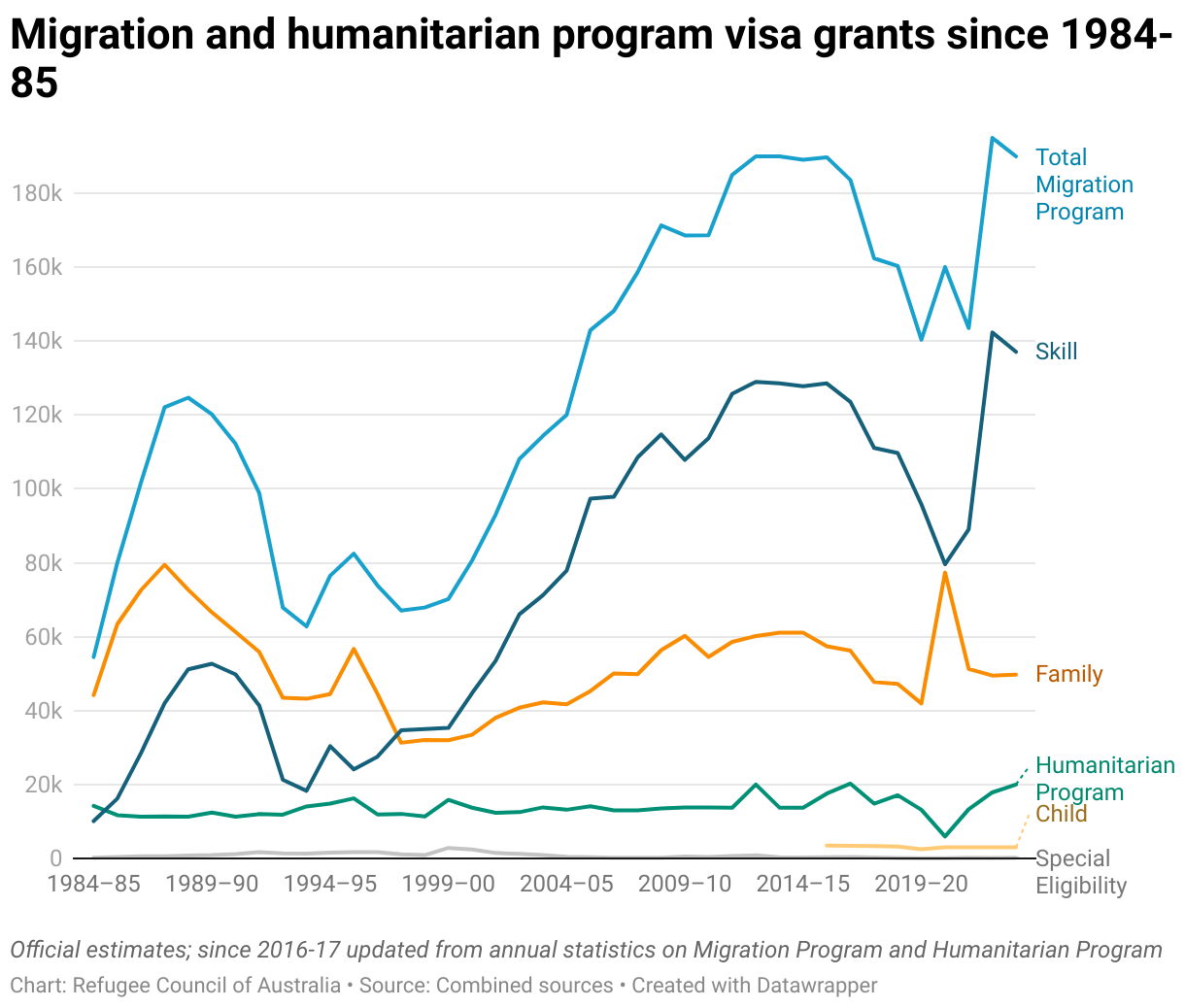 Line chart showing sharp increase in skilled migration corresponding with total migration program, compared to stable numbers for Humanitarian Program.