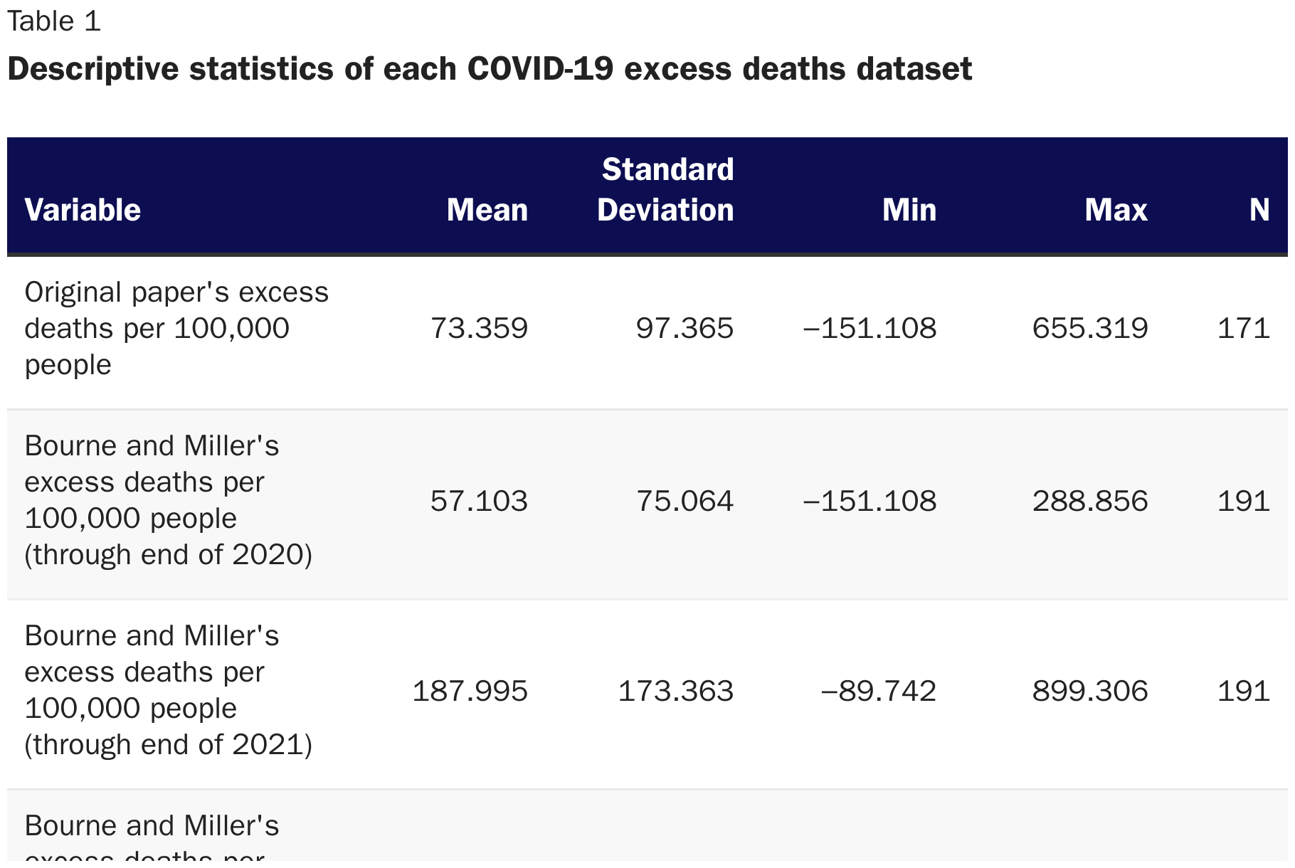 Descriptive statistics of each COVID-19 excess deaths dataset