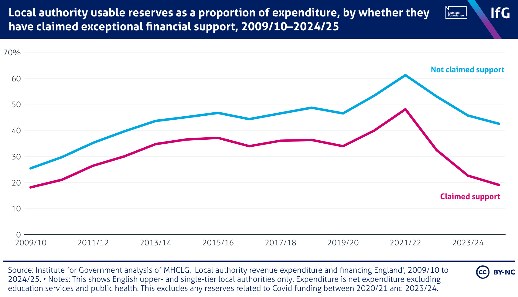A line chart from the Institute for Government of local authority usable reserves as a proportion of expenditure, by whether they have claimed exceptional financial support, 2009/10–2024/25, where authorities' reserves have tended to increase until 2021/22, and have since declined. Those that did not claim support held consistently higher reserves, and the gap between the two groups has widened since 2009/10.