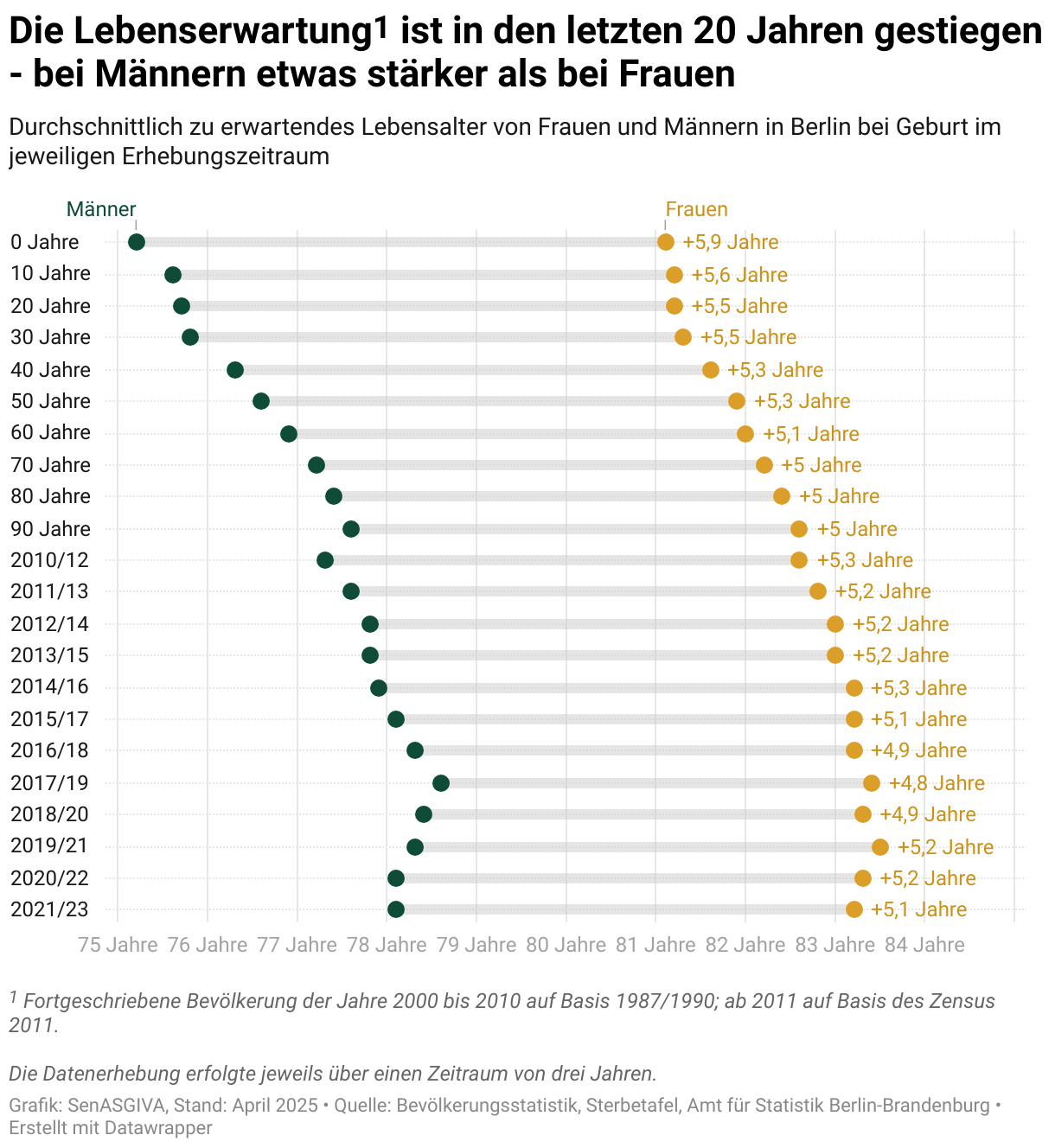 Bei beiden Geschlechtern ist die Lebenserwartung in den letzten 20 Jahren gestiegen. Bei Männern ist dieser Anstieg etwas stärker: Wurden im Jahr 2003 geborene Frauen im Schnitt 5,5 Jahre älter als gleichaltrige Männer, sind es für die im Jahr 2023 Geborenen voraussichtlich nur etwa 5,1 Jahre.
