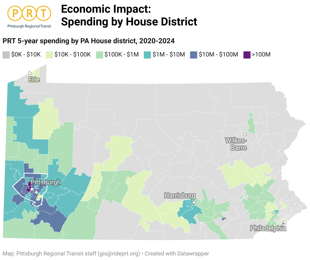 PRT 5-year spending by PA House district, 2020-2024