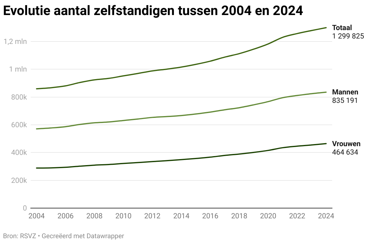 Evolutie aantal zelfstandigen tussen 2004 en 2024