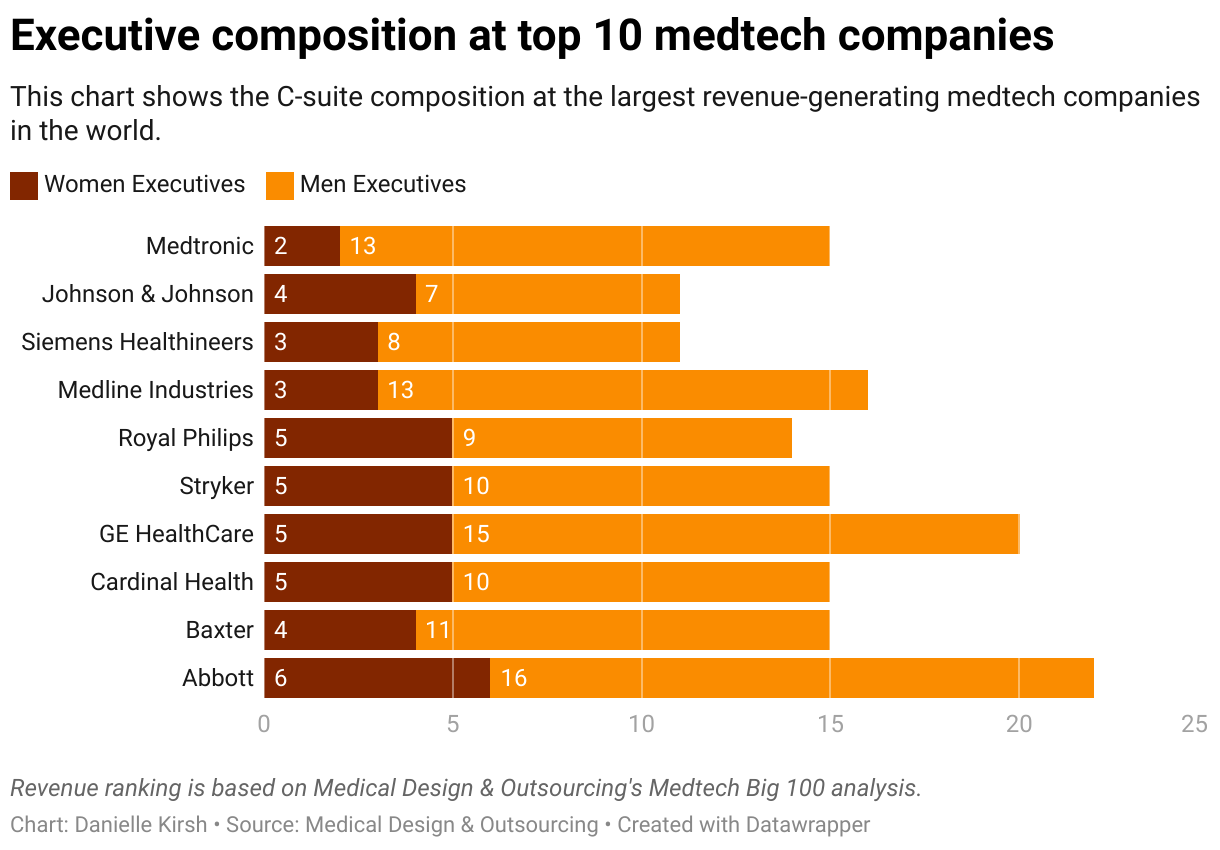This chart shows the C-suite composition at the largest revenue-generating medtech companies in the world.
