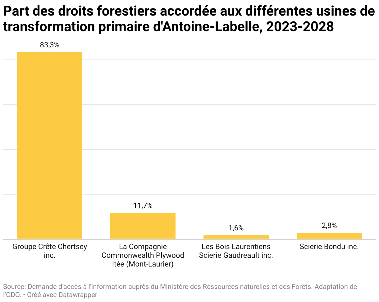 Part des droits forestiers accordée aux différentes usines de transformation primaire d'Antoine-Labelle, 2023-2028