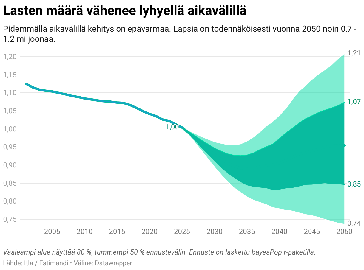 Pidemmällä aikavälillä kehitys on epävarmaa. Lapsia on todennäköisesti vuonna 2050 noin 0,7 - 1.2 miljoonaa.