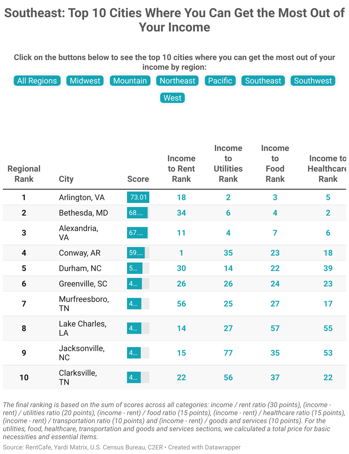 Click on the buttons below to see the top 10 cities where you can get the most out of your income by region: All Regions Midwest Mountain Northeast Pacific Southeast Southwest West