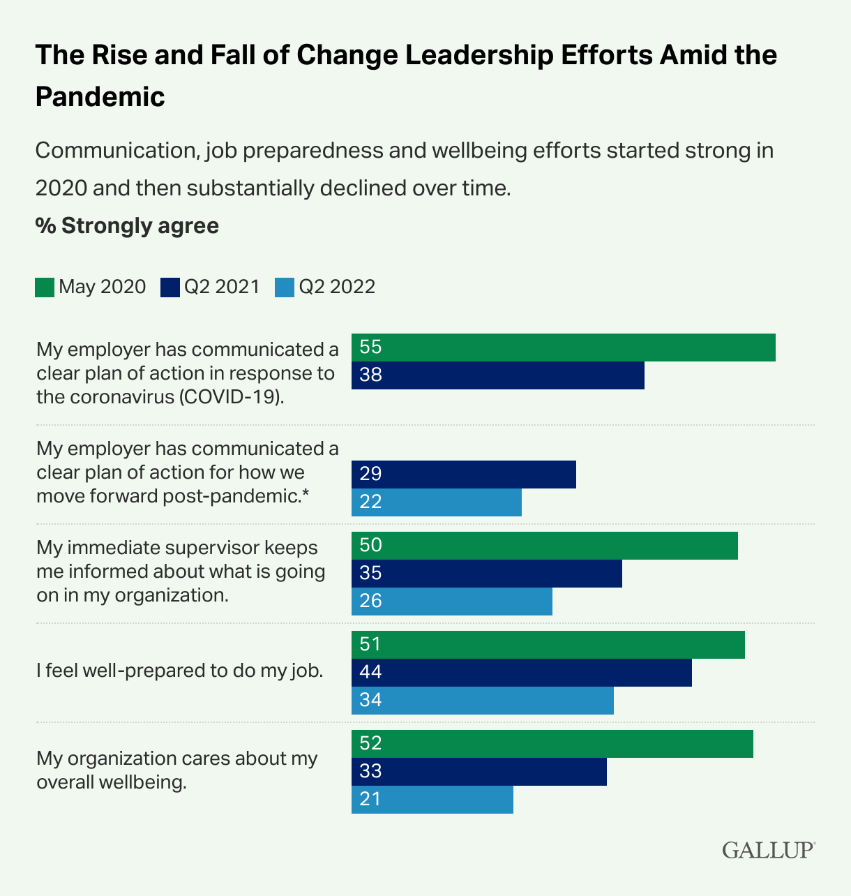 A grouped bar chart illustrating the decline in change leadership efforts from the early pandemic to 2022, showing that in May 2020, 55% of employees strongly agreed their employer had communicated a clear plan of action, but this dropped to 22% by 2022. Similarly, perceptions of leadership communication, job preparedness, and employer care for wellbeing all declined significantly over time.