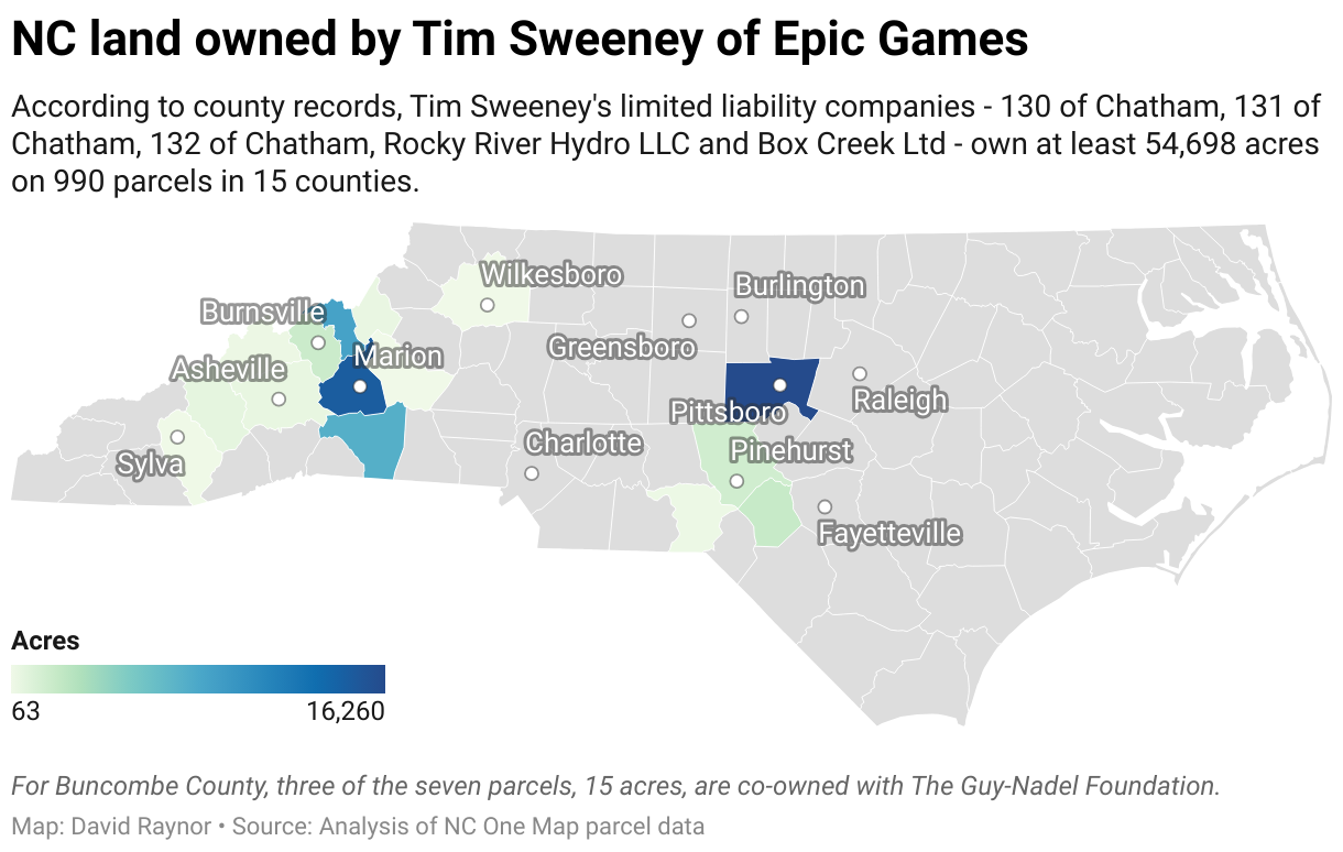 According to county records, Tim Sweeney's limited liability companies - 130 of Chatham, 131 of Chatham, 132 of Chatham, Rocky River Hydro LLC and Box Creek Ltd - own at least 54,698 acres on 990 parcels in 15 counties.