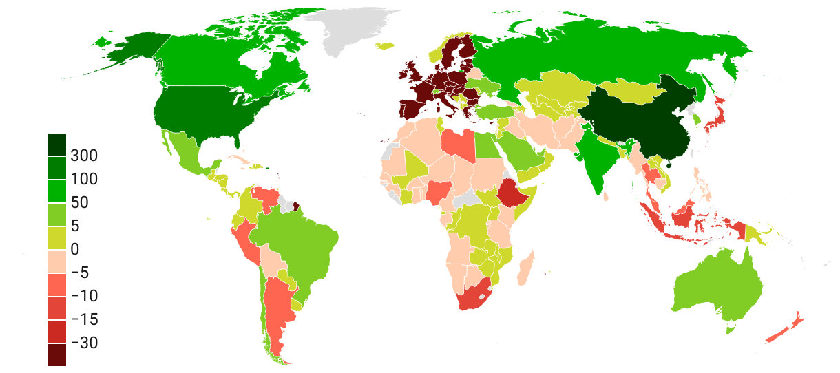 Mapa de las variaciones absolutas de presencia global para cada país entre 2020 y 2024. Desde 2020 la globalización es liderada por EEUU y China, mientras que la UE pierde presencia de manera notoria (variación -30, en rojo oscuro). África, el sudeste asiático y, en menor medida, América Latina, también pierden presencia. Excepciones a esa tendencia son la India y Brasil, que incrementan su presencia en los últimos cuatro años.