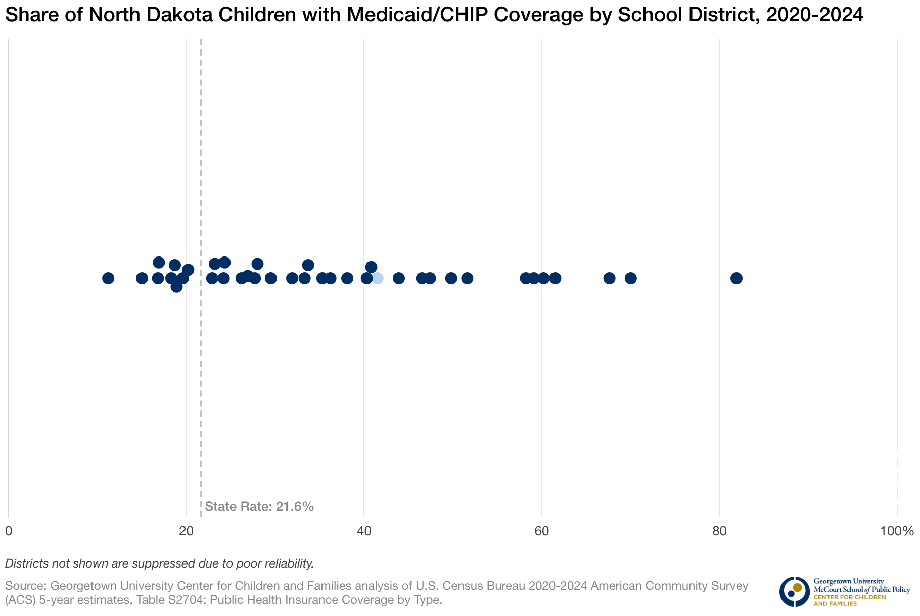 Share of North Dakota Children with Medicaid/CHIP Coverage by School District, 2020-2024