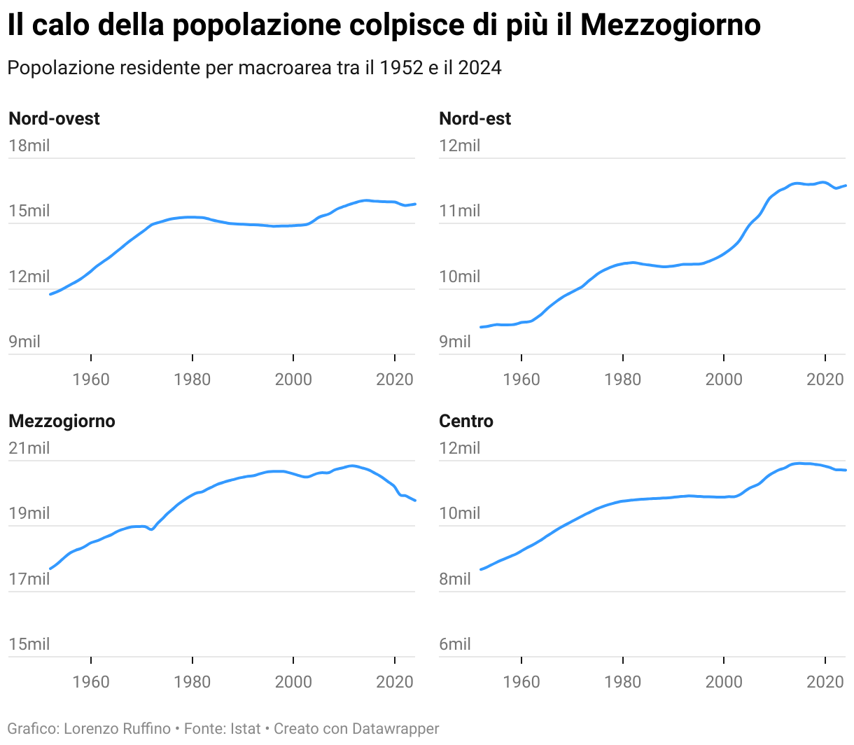 Popolazione residente per macroarea tra il 1952 e il 2024