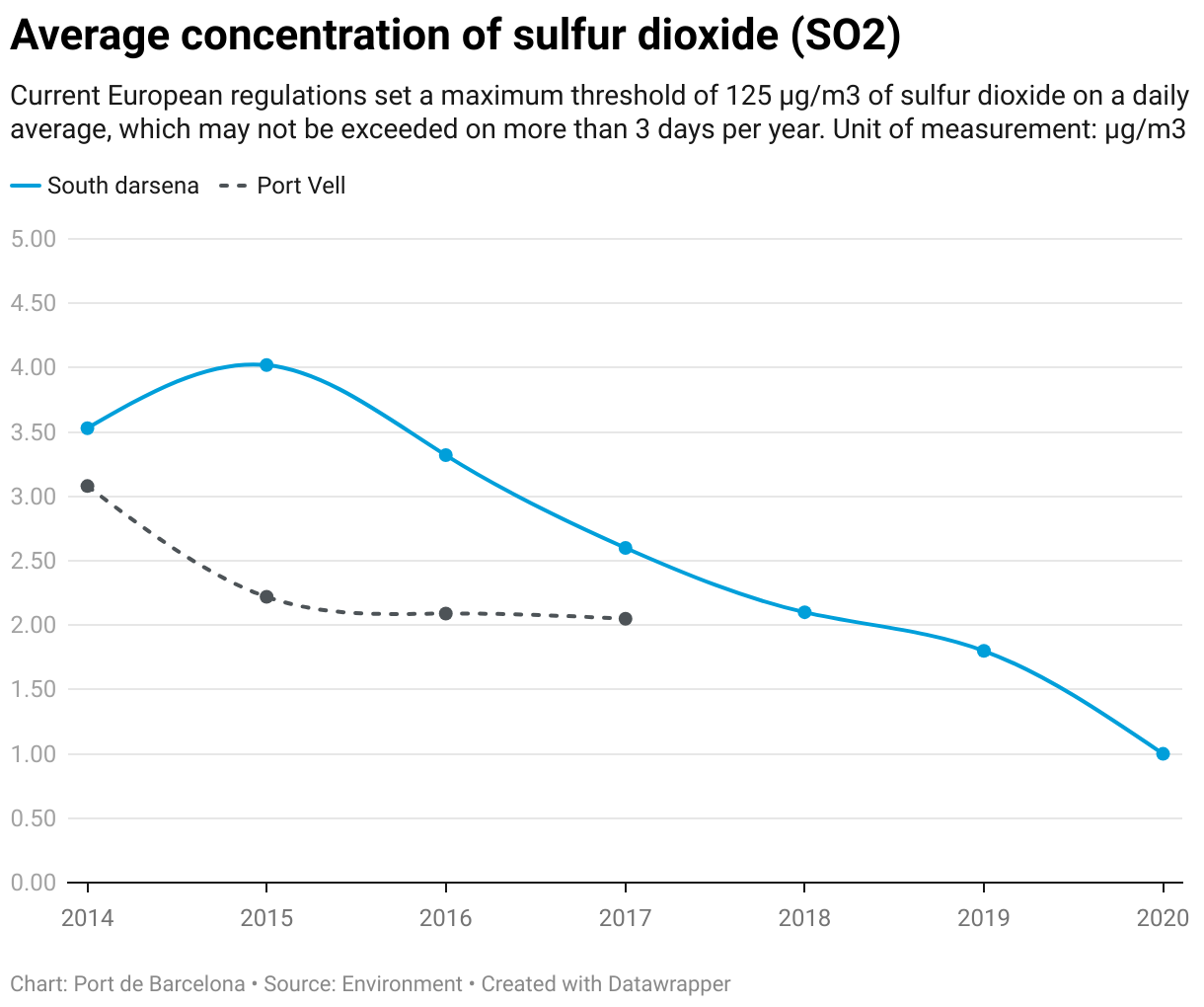 Current European regulations set a maximum threshold of 125 µg/m3 of sulfur dioxide on a daily average, which may not be exceeded on more than 3 days per year. Unit of measurement: µg/m3