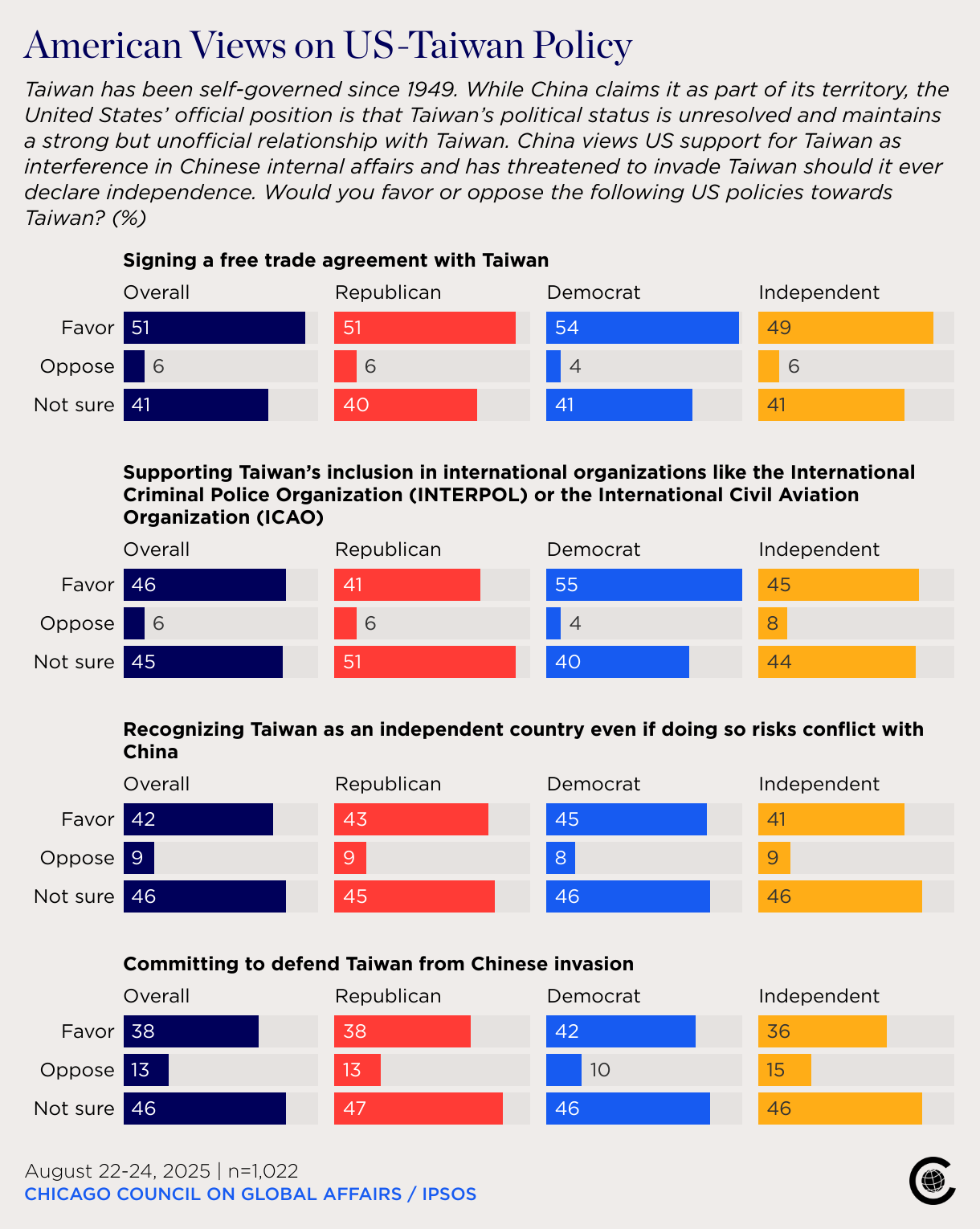 Taiwan has been self-governed since 1949. While China claims it as part of its territory, the United States’ official position is that Taiwan’s political status is unresolved and maintains a strong but unofficial relationship with Taiwan. China views US support for Taiwan as interference in Chinese internal affairs and has threatened to invade Taiwan should it ever declare independence. Would you favor or oppose the following US policies towards Taiwan? (%)