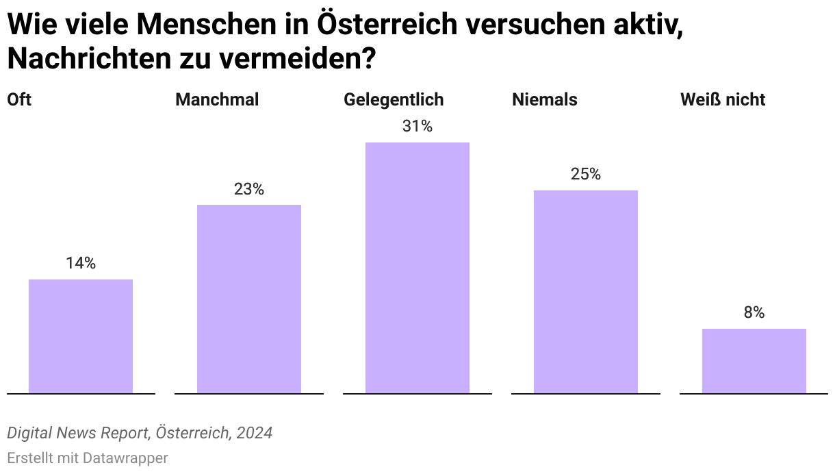 Balkendiagramm aus dem Digital News Report 2024 für Österreich, das zeigt, wie viele Menschen aktiv versuchen, Nachrichten zu vermeiden: Oft 14%, Manchmal 23%, Gelegentlich 31%, Niemals 25%, Weiß nicht 8%.