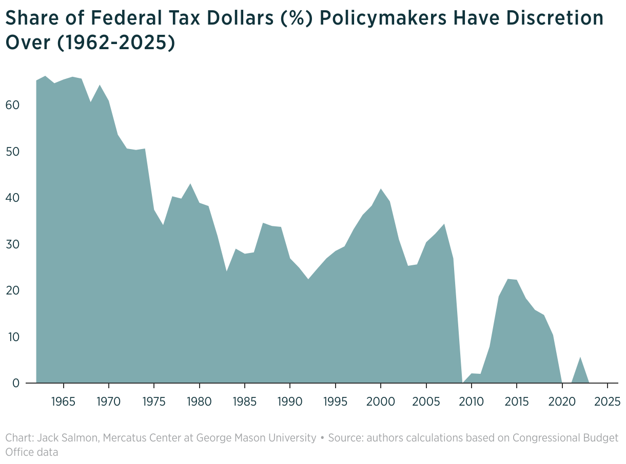 Share of Federal Tax Dollars (%) Policymakers Have Discretion Over (1962-2025)