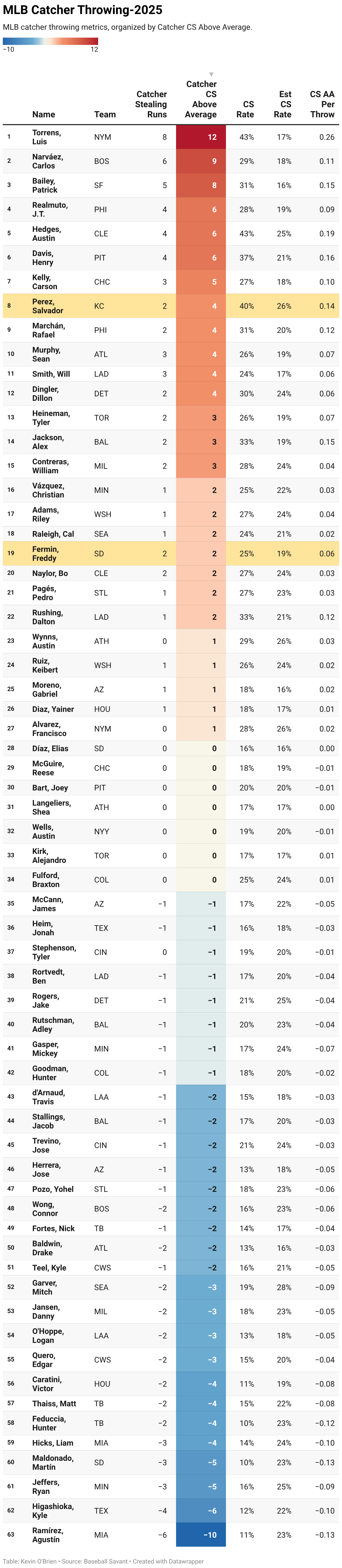 MLB catcher throwing metrics, organized by Catcher CS Above Average.