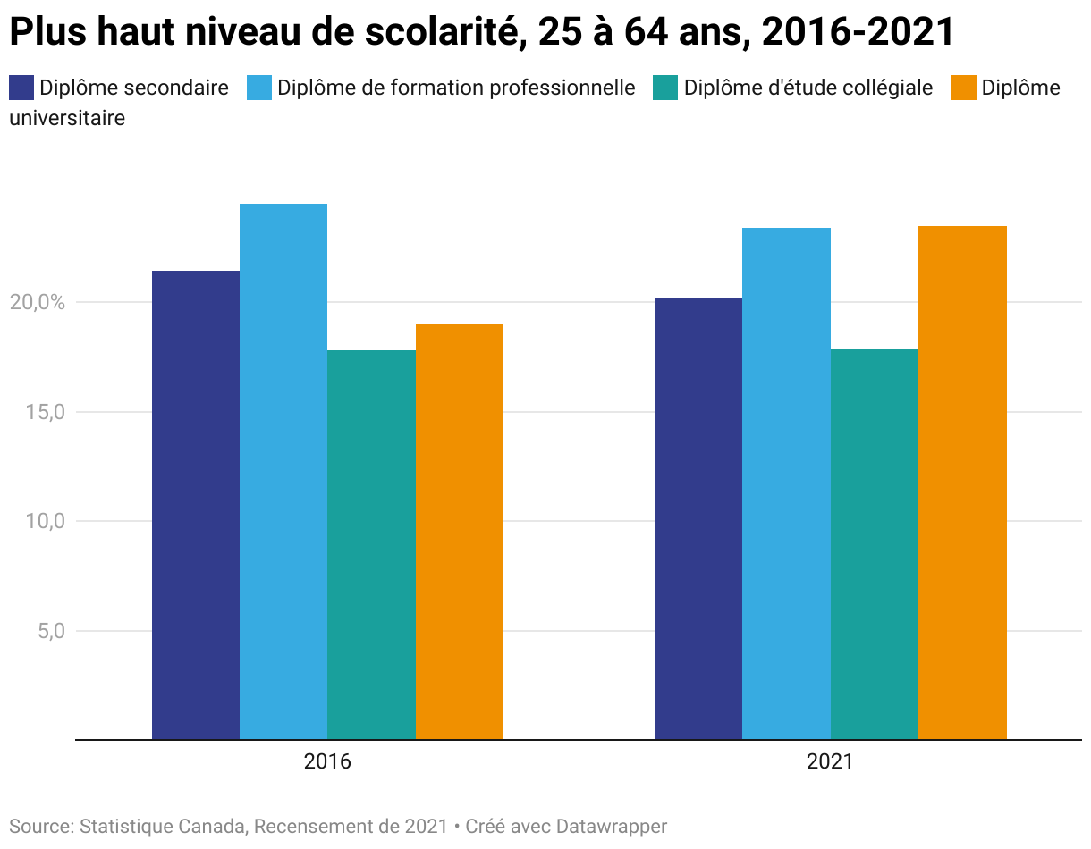 Plus haut niveau de scolarité, 25 à 64 ans, 2016-2021