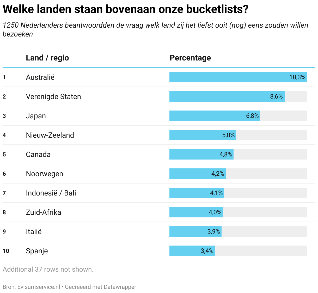 1250 Nederlanders beantwoordden de vraag welk land zij het liefst ooit (nog) eens zouden willen bezoeken