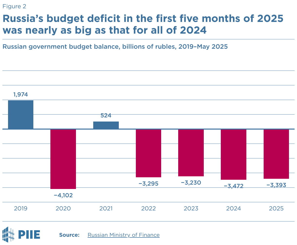 Russian government budget balance, billions of rubles, 2019–May 2025