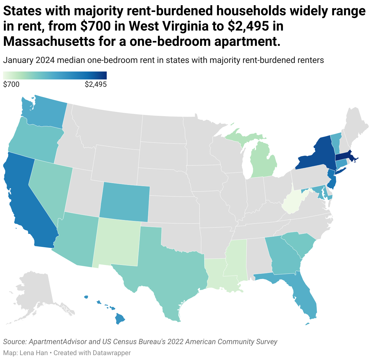 January 2024 median one-bedroom rent in states with majority rent-burdened renters