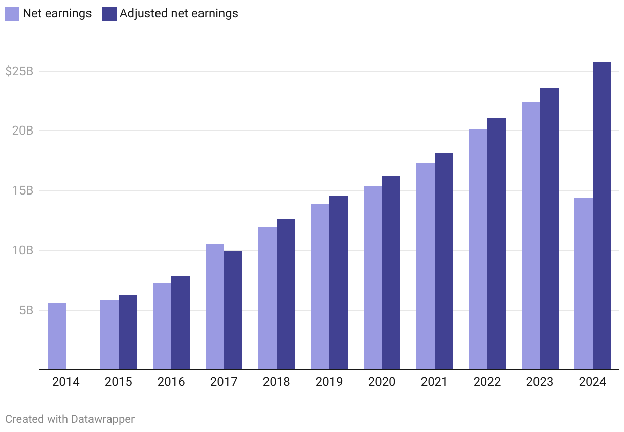Hover over columns to see earnings amounts. Both unadjusted and adjusted net earnings are attributable to UnitedHealth Group common shareholders. UnitedHealth did not report adjusted financial results in 2014.
