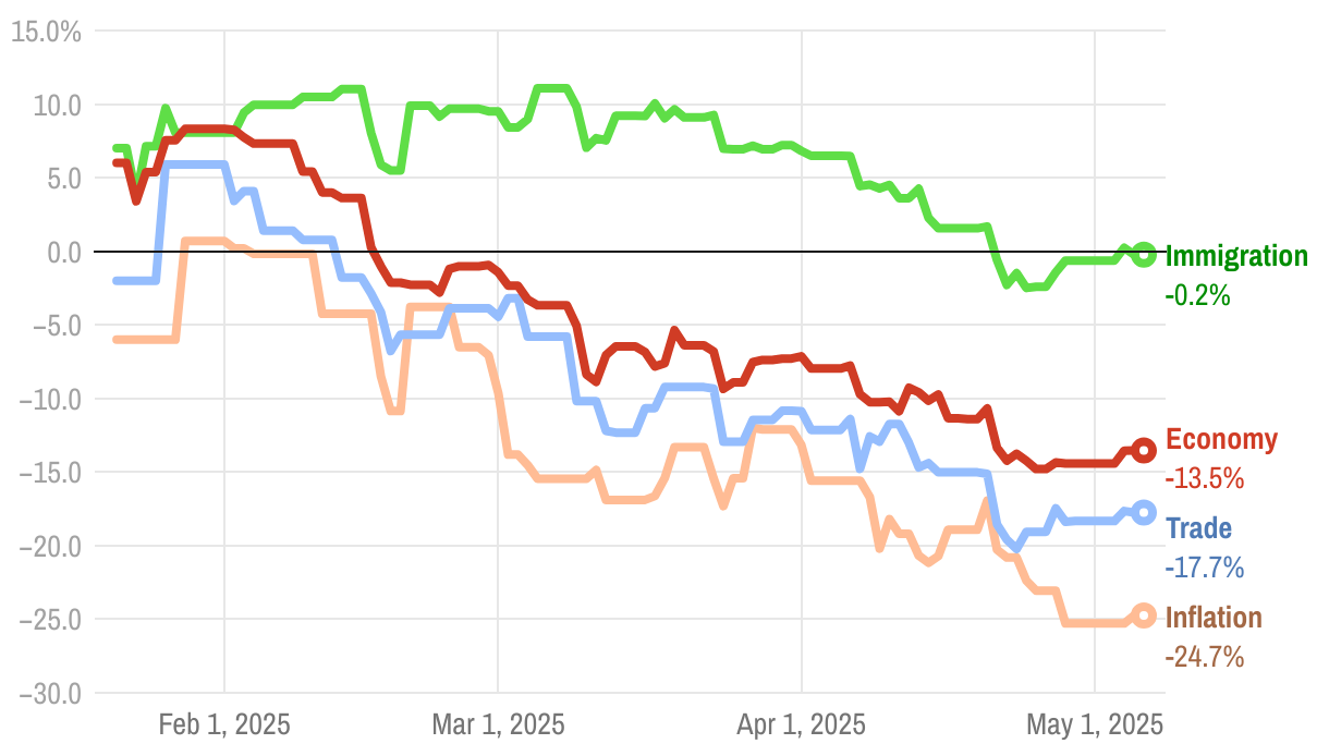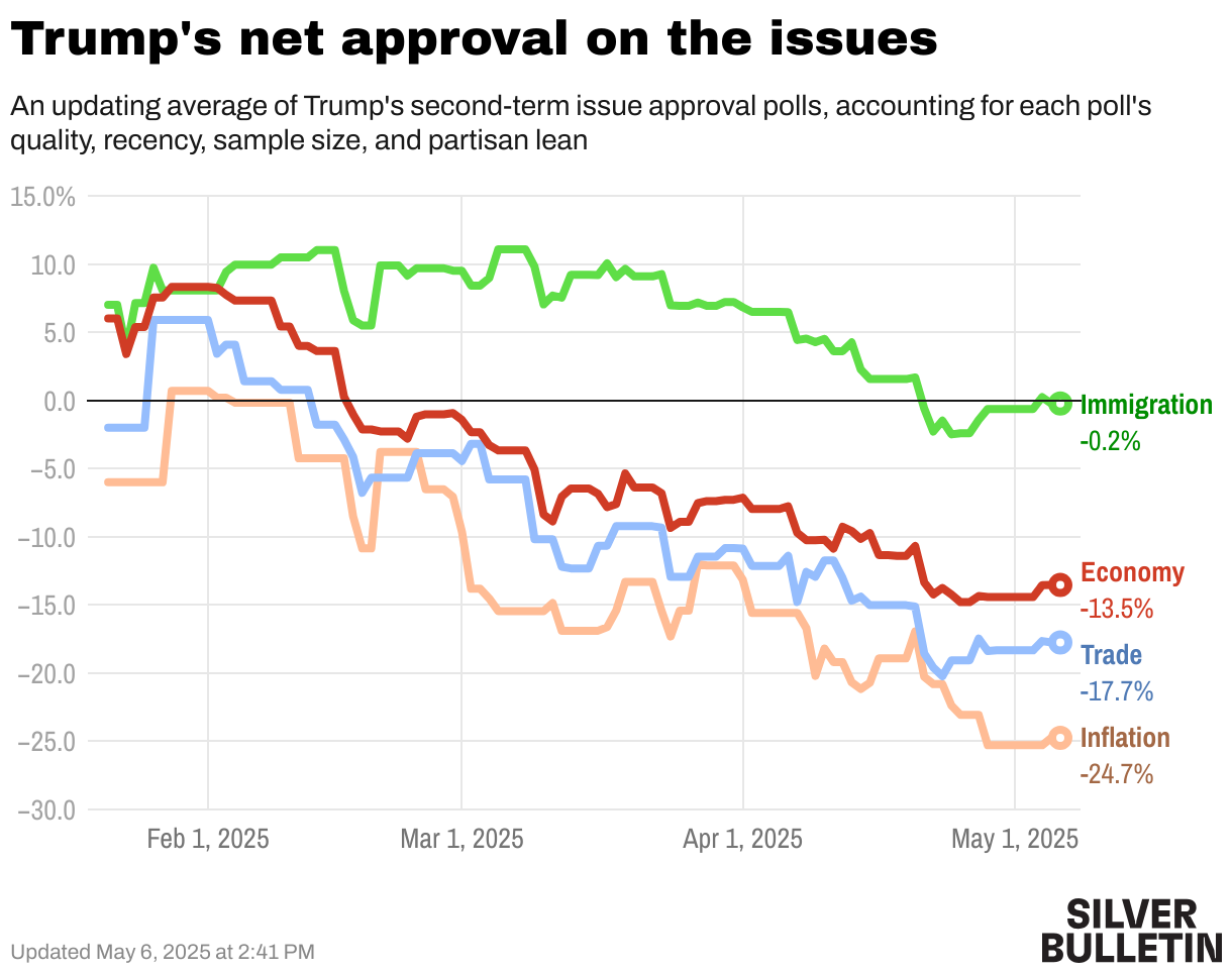 An updating average of Trump's second-term issue approval polls, accounting for each poll's quality, recency, sample size, and partisan lean