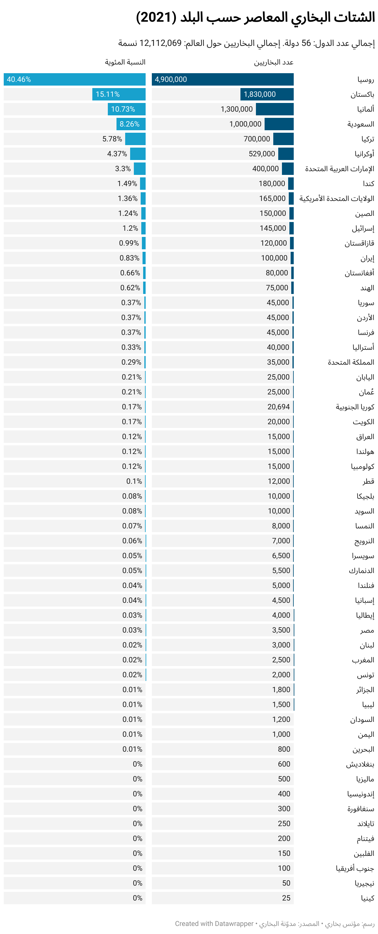 إجمالي عدد الدول: 56 دولة. إجمالي البخاريين حول العالم: 12,112,069 نسمة