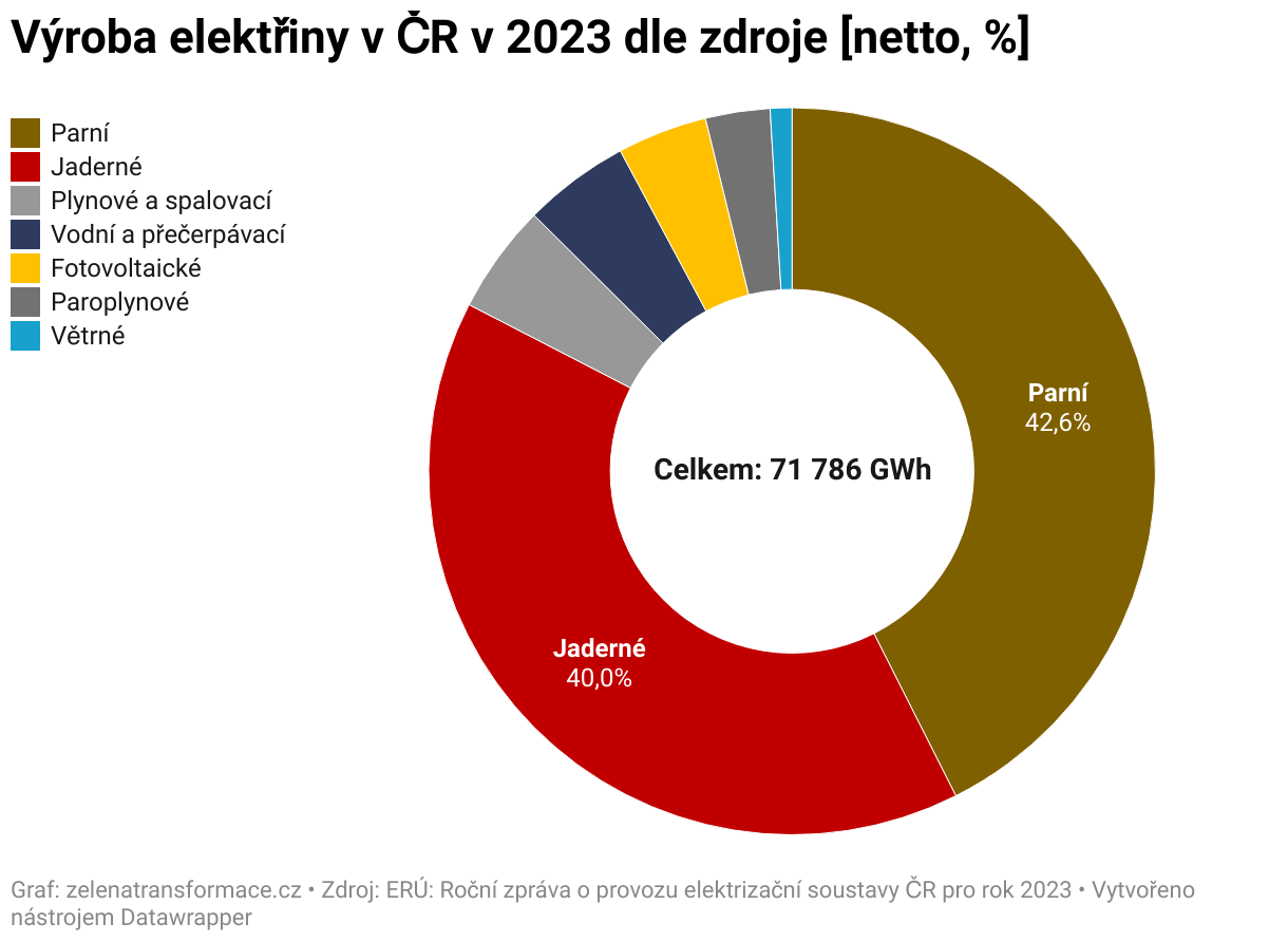 Výroba elektřiny v ČR v 2023 dle zdroje [netto, %]