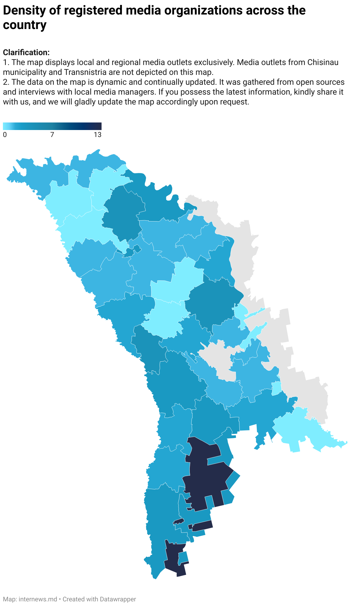 1. The map displays local and regional media outlets exclusively. Media outlets from Chisinau municipality and Transnistria are not depicted on this map.