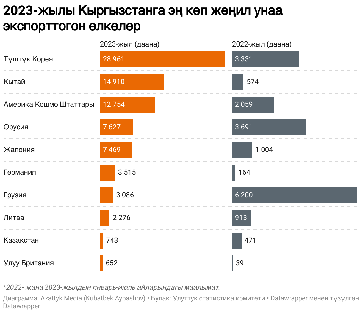 2023-жылы Кыргызстанга эң көп жеңил унаа экспорттогон өлкөлөр