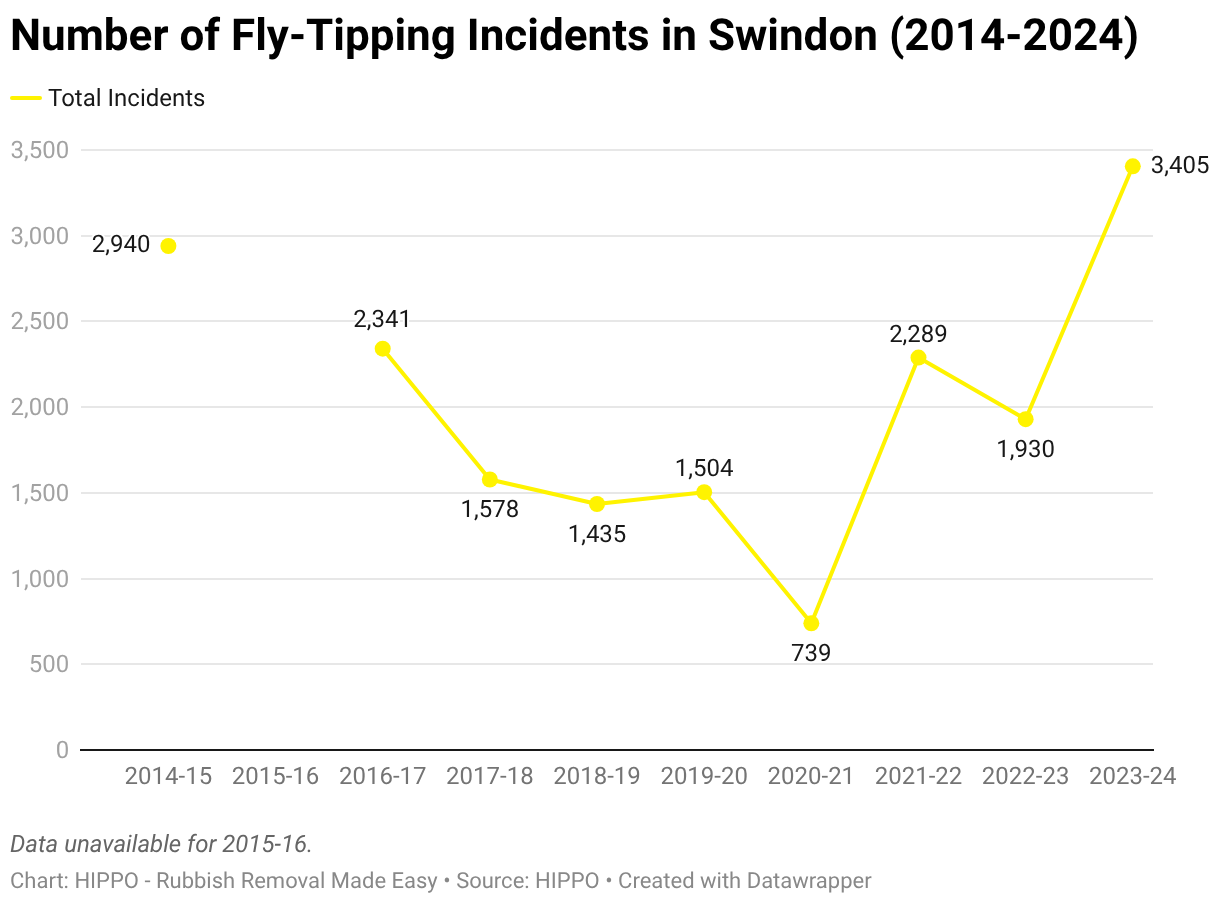 A chart displaying the total number of fly-tipping incidents in Swindon for the years reported by the government. 2014-15: 2940. 2015-16: Unavailable. 2016-17: 2341. 2017-18: 1578. 2018-19: 1435. 2019-20: 1504. 2020-21: 739. 2021-22: 2289. 2022-23: 1930. 2023-24: 3405.