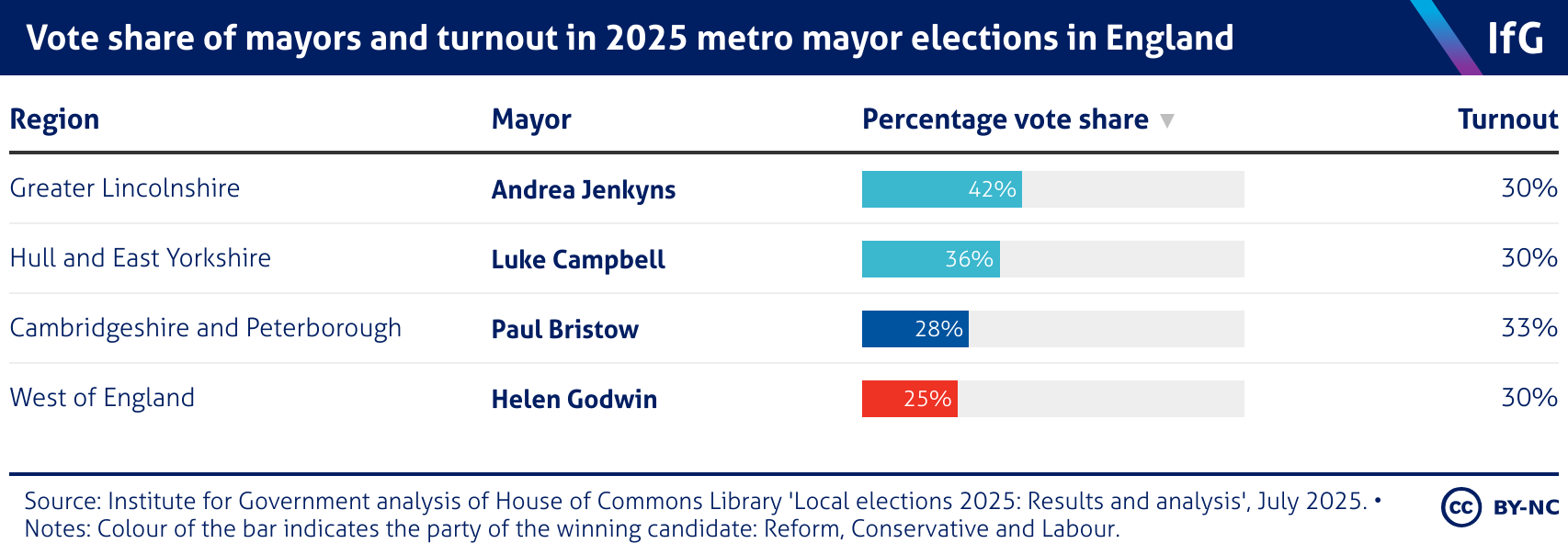 A table from the Institute for Government, showing the mayors elected in the May 2024 elections, the regions they represent, their percentage vote share and turnout.
