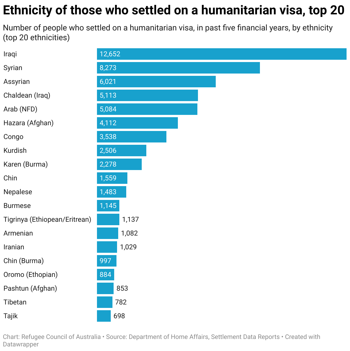 Number of people who settled on a humanitarian visa, in past five financial years, by ethnicity (top 20 ethnicities)