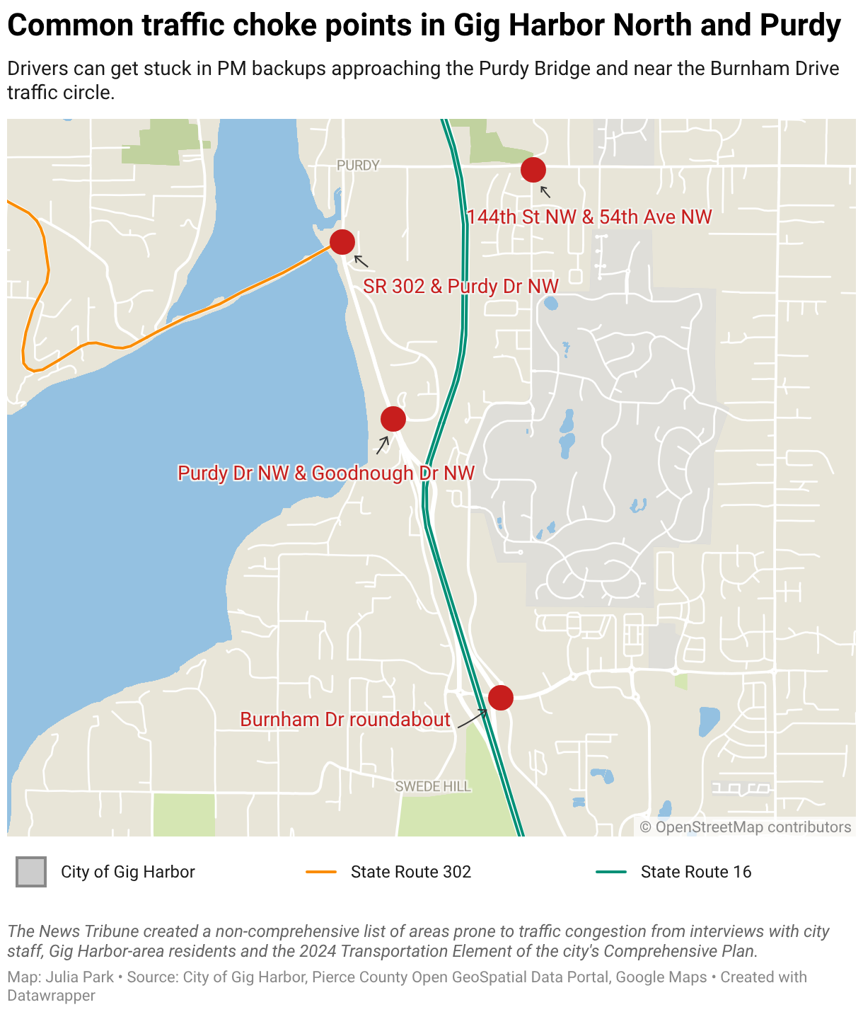 Drivers can get stuck in PM backups approaching the Purdy Bridge and near the Burnham Drive traffic circle.