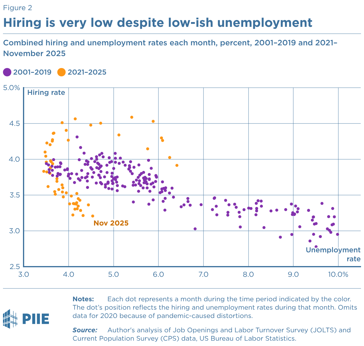 Combined hiring and unemployment rates each month, percent, 2001–2019 and 2021–November 2025