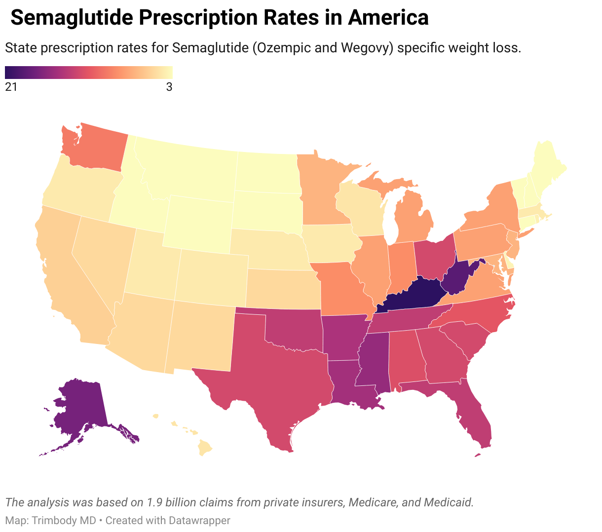 State prescription rates for Semaglutide (Ozempic and Wegovy) specific weight loss.