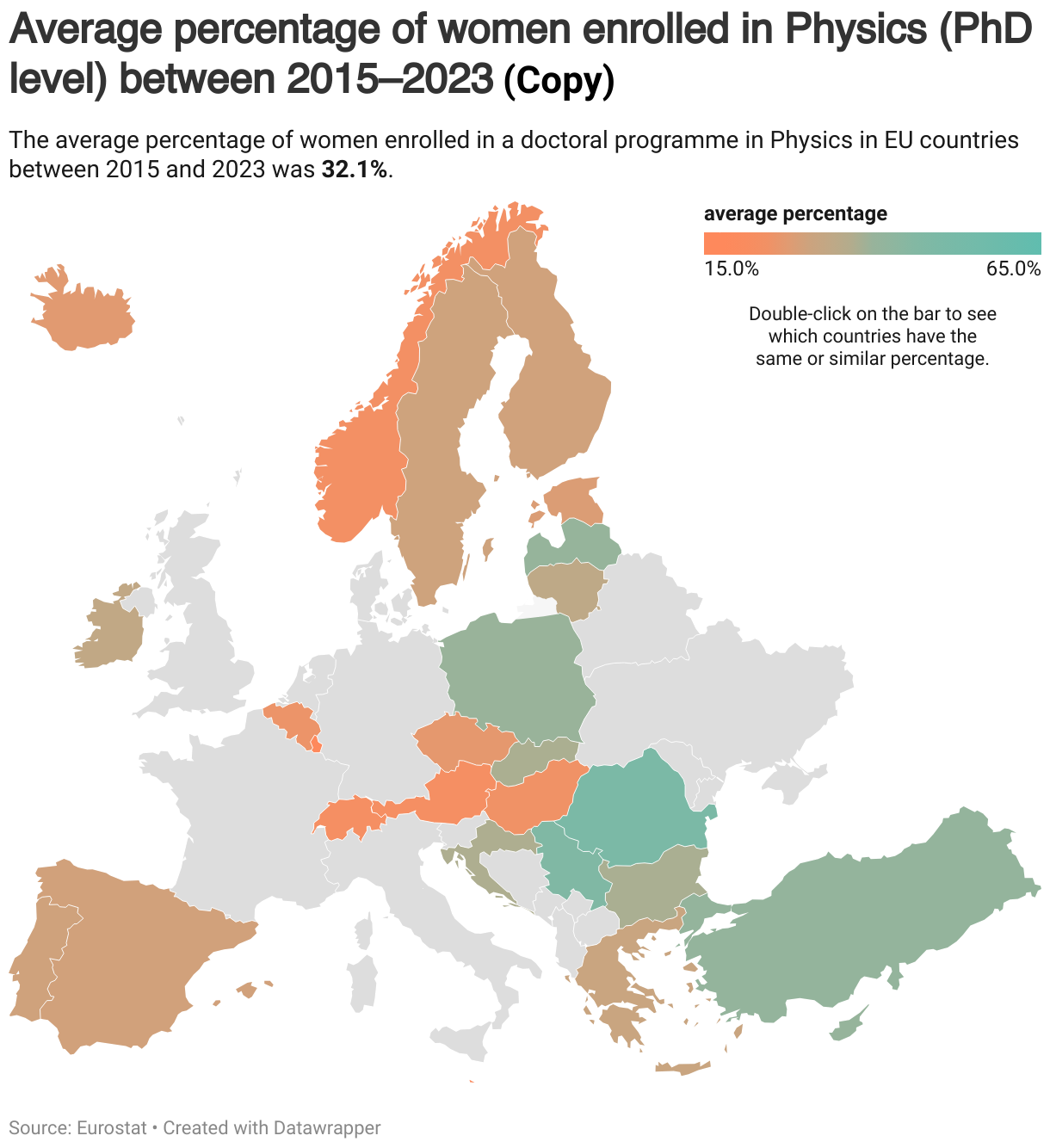 The average percentage of women enrolled in a doctoral programme in Physics in EU countries between 2015 and 2023 was 32.1%.