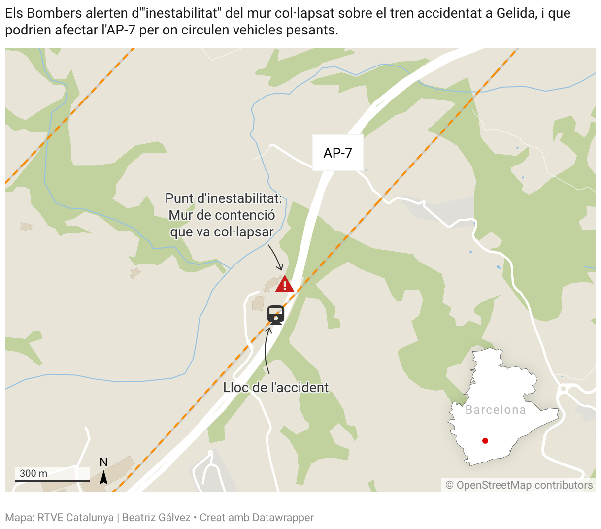 Els Bombers alerten d'"inestabilitat" del mur col·lapsat sobre el tren accidentat a Gelida, i que podrien afectar l'AP-7 per on circulen vehicles pesants.