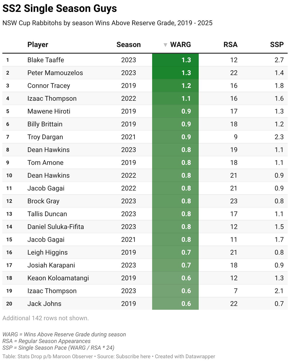 NSW Cup Rabbitohs by season Wins Above Reserve Grade, 2019 - 2025