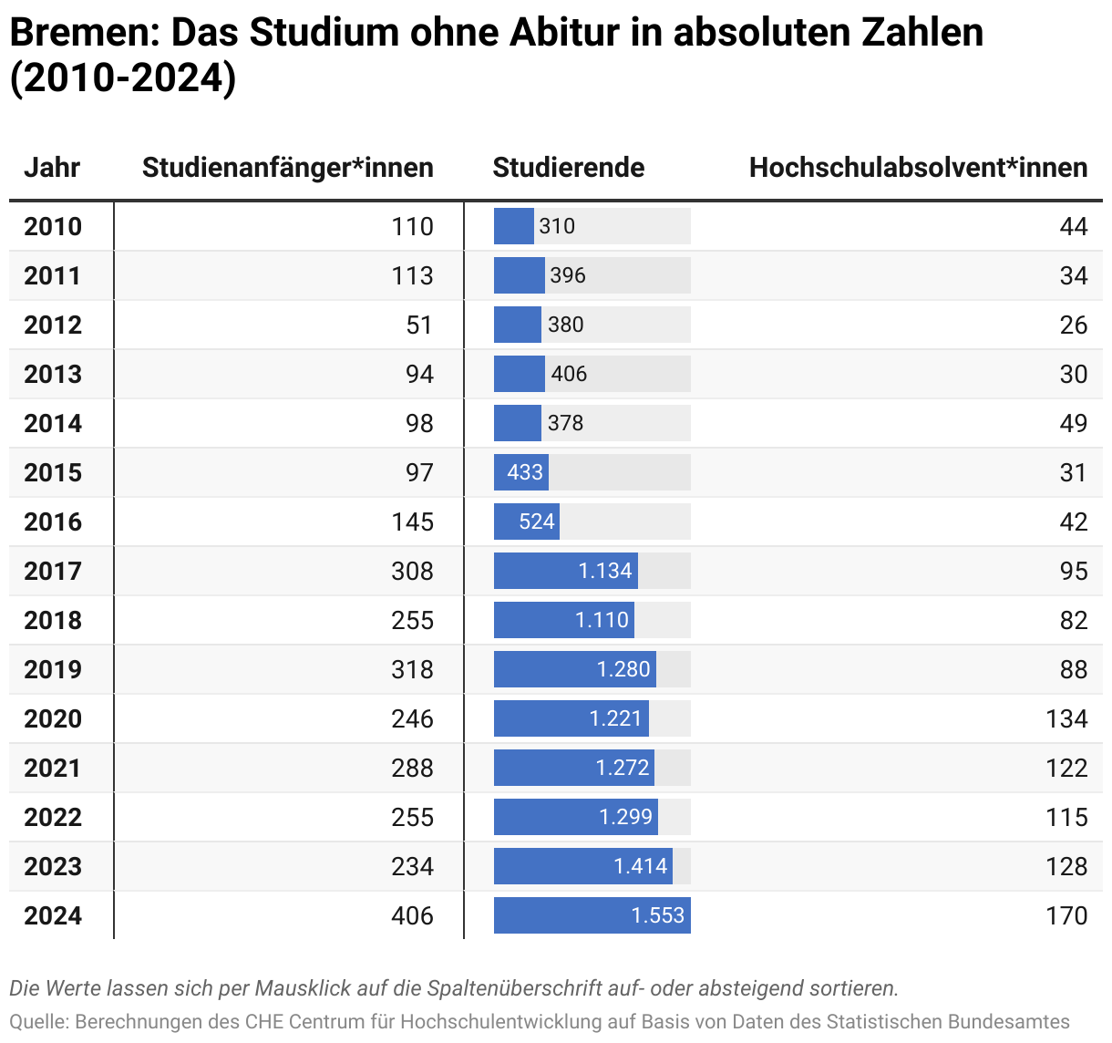 Bremen: Das Studium ohne Abitur in absoluten Zahlen (2010-2024)