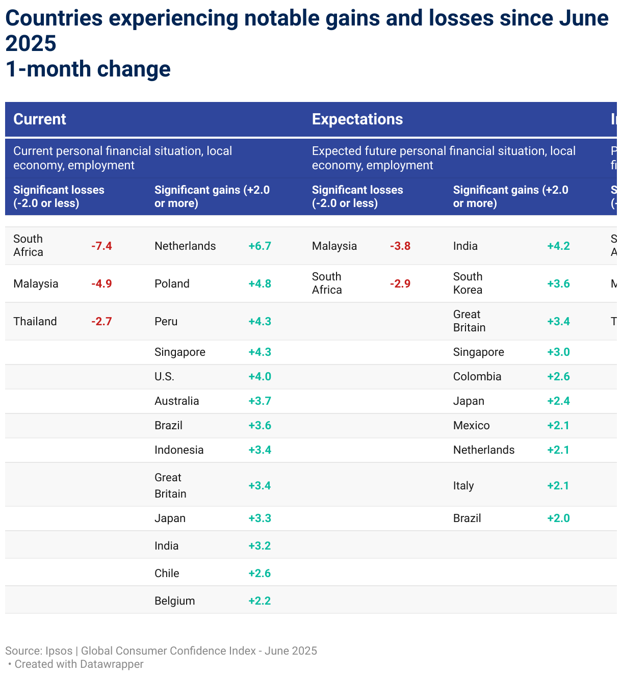 Countries experiencing notable gains and losses since June 2025 1-month change