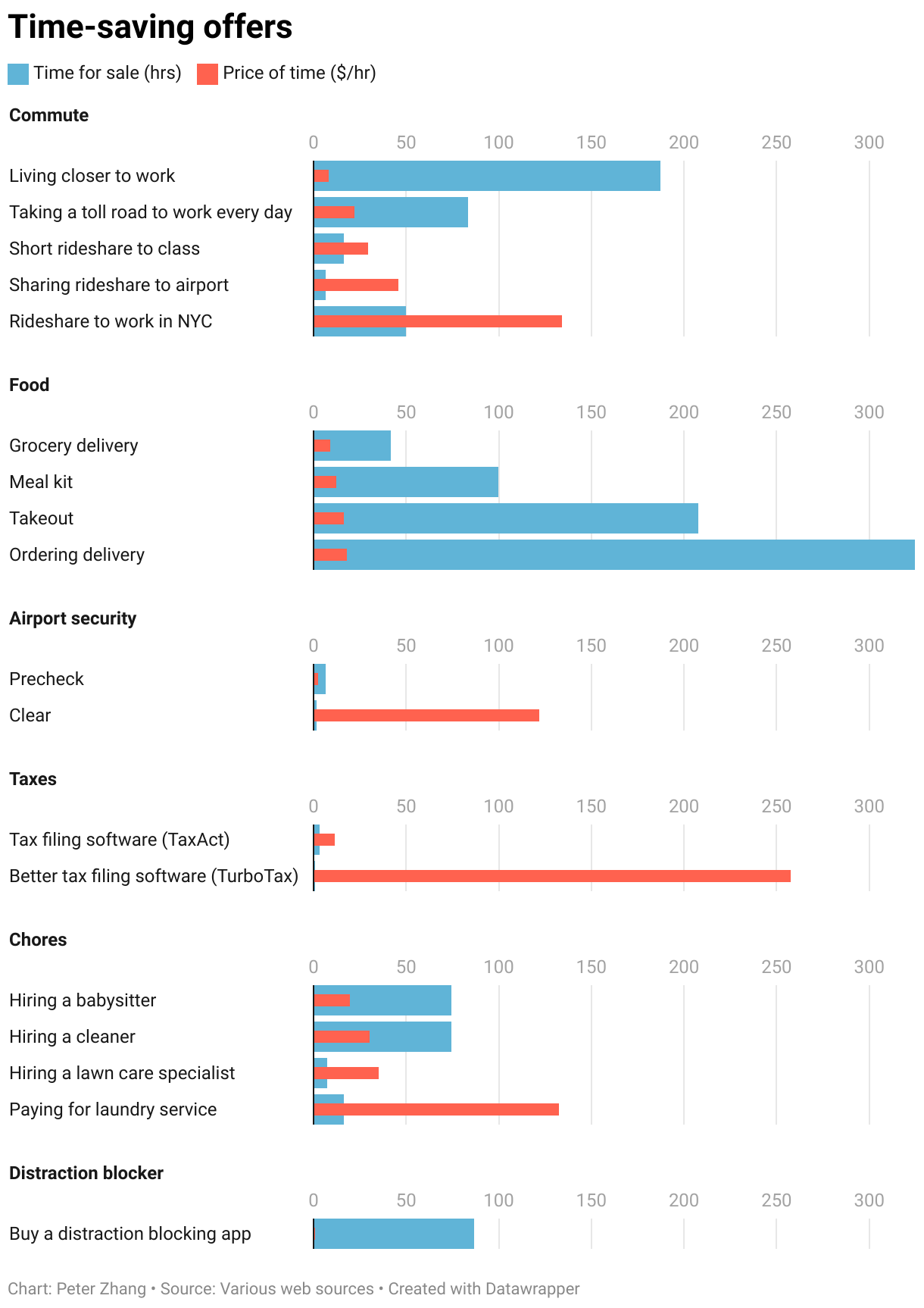 A chart which shows the time for sale and price of time for different activities. The most time for sale comes from living closer to work, ordering delivery, takeout, meal kids, and distraction blockers. The cheapest time is living closer to wrok, getting TSA precheck, and buying a distraction blocker.