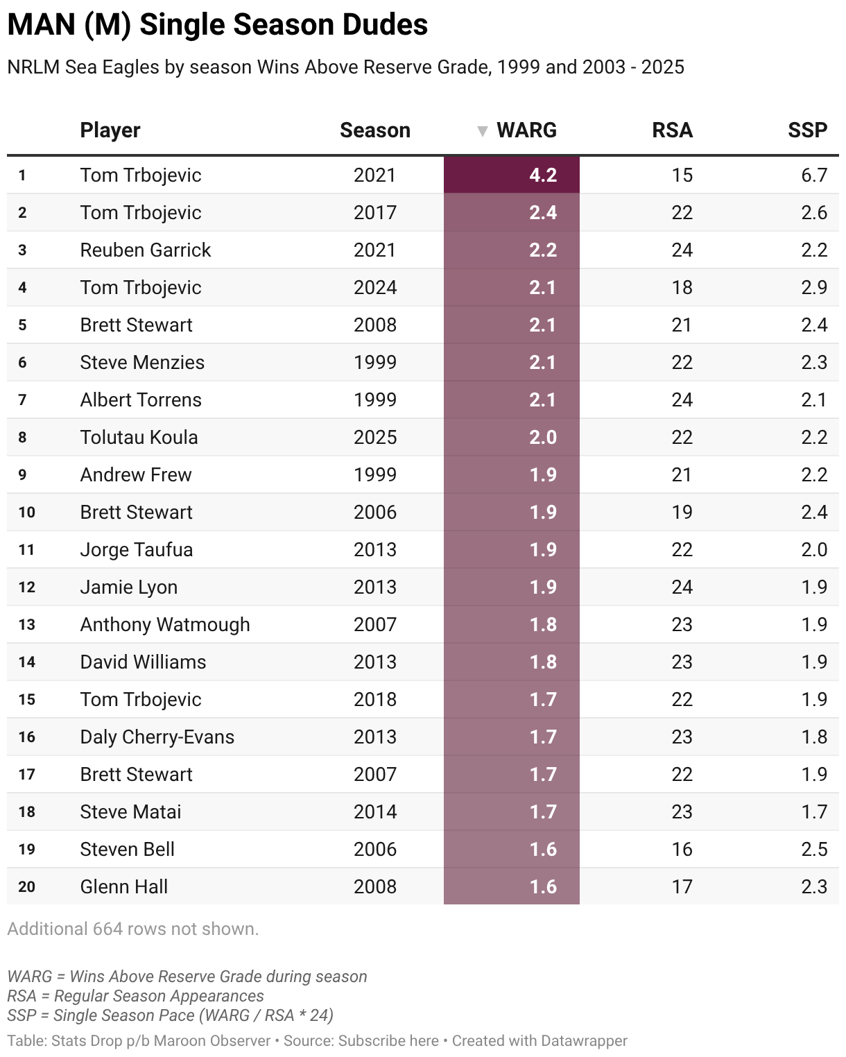 NRLM Sea Eagles by season Wins Above Reserve Grade, 1999 and 2003 - 2025