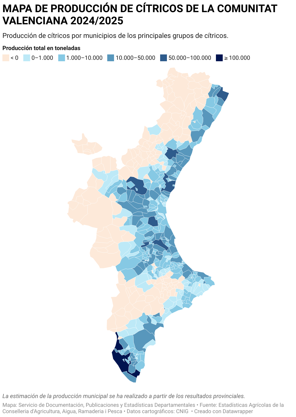 Producción de cítricos por municipios de los principales grupos de cítricos.