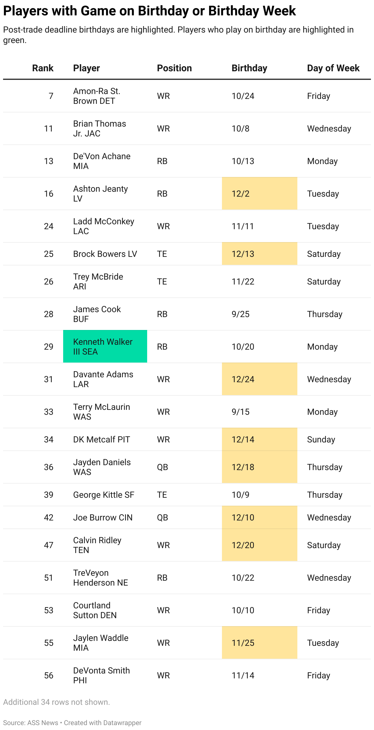 Post-trade deadline birthdays are highlighted. Players who play on birthday are highlighted in green.