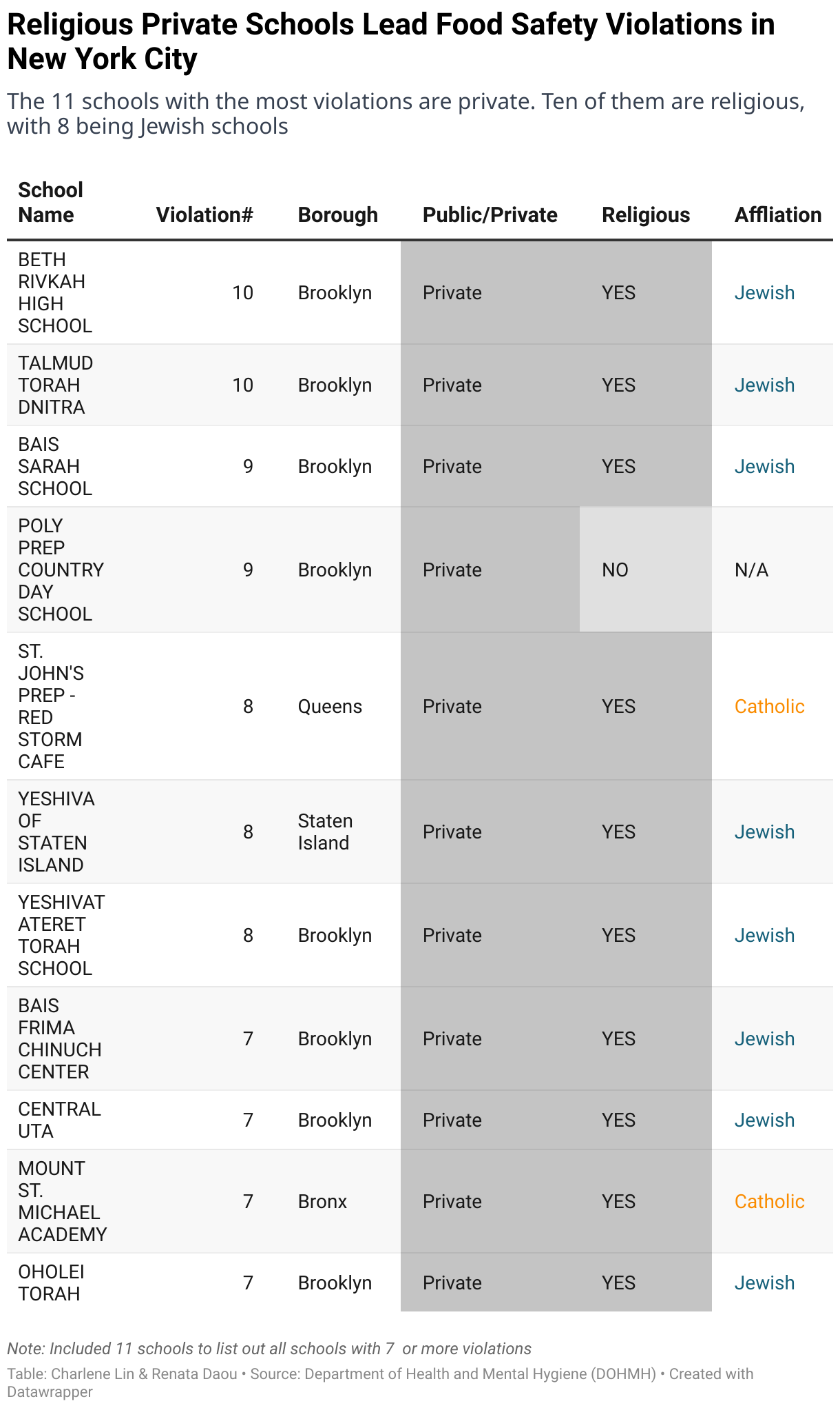 The 11 schools with the most violations are private. Ten of them are religious, with 8 being Jewish schools